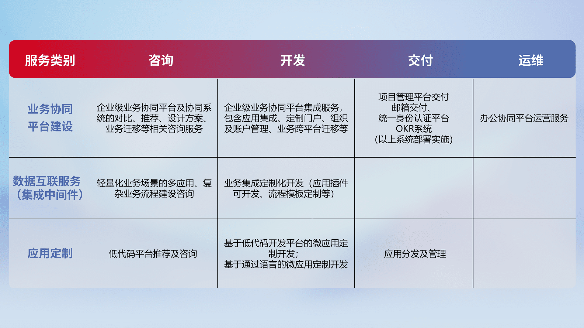 针对钉钉、、、企微、、、、IDaas等平台级产品提供产品的规划、、方案、、、、交付、、、定制化开发等服务,,,实现如统一协同办公、、、智能客户服务、、混合会议管理、、智能数据查询、、等业务场景,,,实现数字化转型。。。